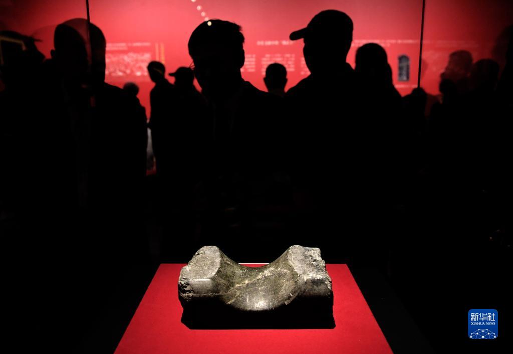 4月27日,參觀(guān)者在曹操高陵遺址博物館內觀(guān)看展品“魏武王常所用慰項石”石枕。