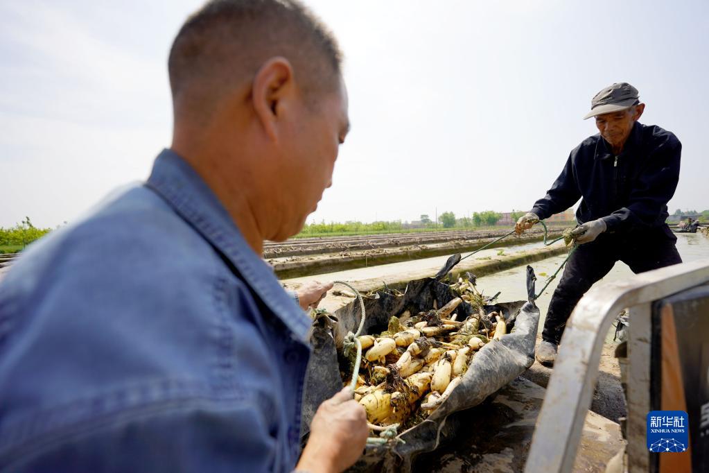 4月27日,在河北邢臺經(jīng)濟開(kāi)發(fā)區九家鋪村清水藕基地,農民在搬運藕苗。