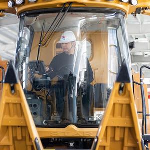 4月26日,宮照旭在公司生產(chǎn)車(chē)間內試駕其自主研發(fā)生產(chǎn)的全地形履帶式玉米收割機。