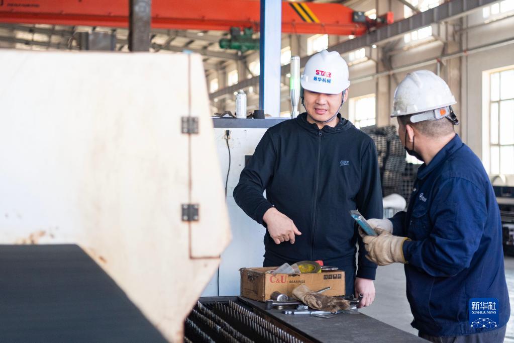 4月26日,宮照旭(左)在公司生產(chǎn)車(chē)間內和工人交流,了解生產(chǎn)有關(guān)情況。