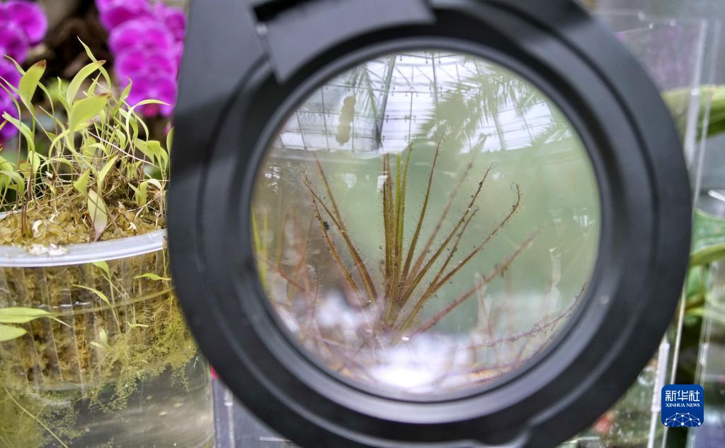 這是4月27日在國家植物園溫室內透過(guò)放大鏡拍攝的美杜莎捕蟲(chóng)樹(shù)。