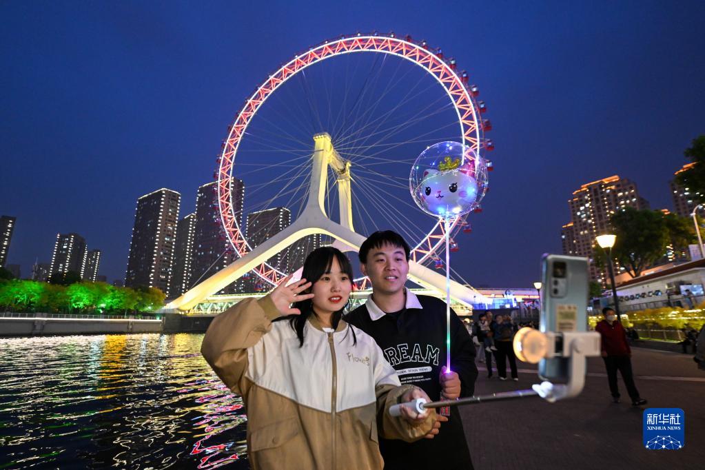4月27日,游客在海河親水平臺與“天津之眼”摩天輪留影。