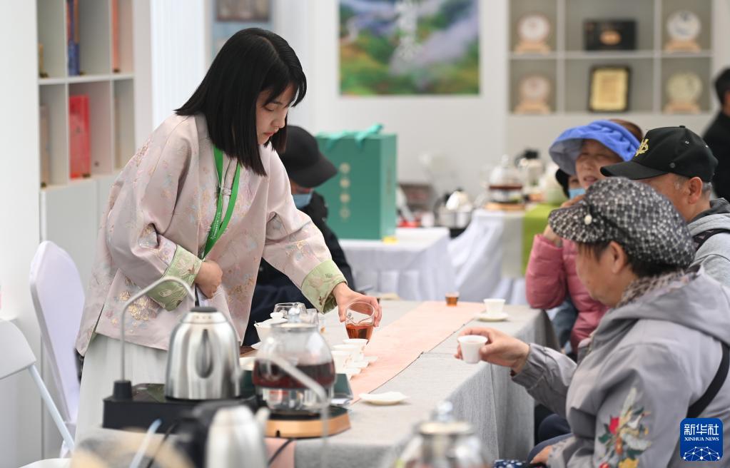 4月28日,來(lái)自福建柘榮縣的茶藝師(左一)為游客泡茶。