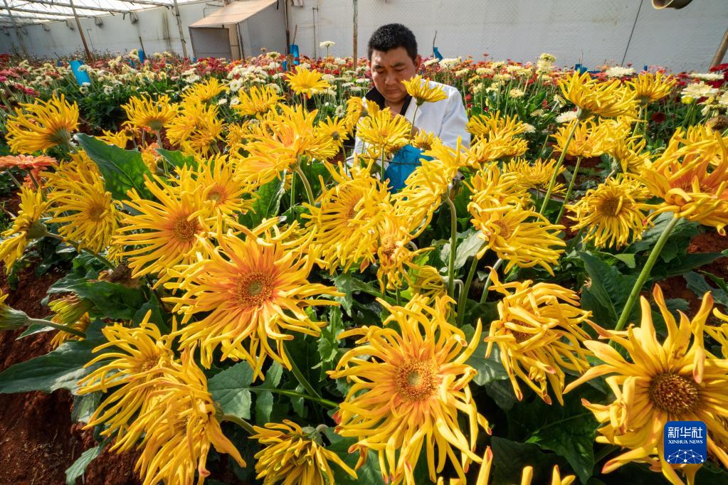 云南錦科花卉工程研究中心技術(shù)人員王江兵在觀(guān)測非洲菊新品種(4月3日攝)。
