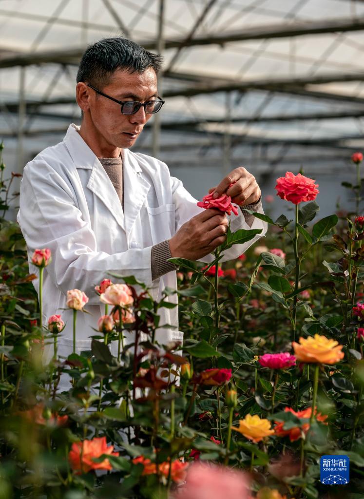 云南錦科花卉工程研究中心技術(shù)人員田連通在進(jìn)行雜交授粉(4月3日攝)。