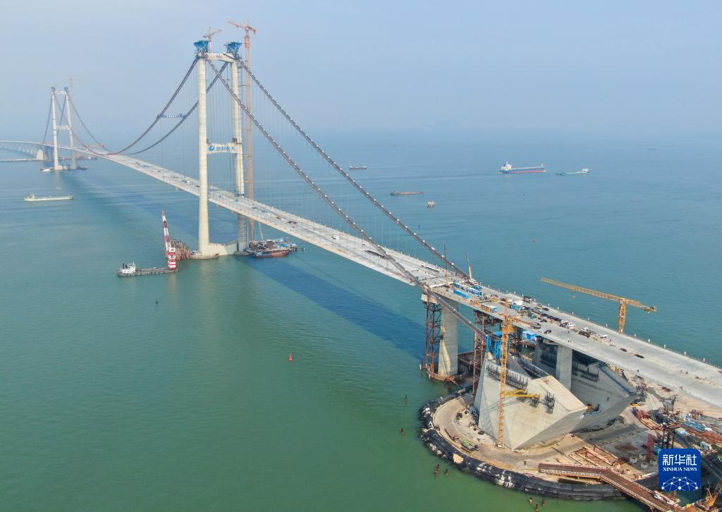 這是4月27日拍攝的深中通道伶仃洋大橋及西錨碇(無(wú)人機照片)。