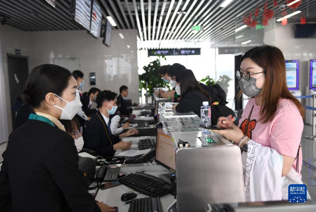 4月28日,旅客在廣州琶洲港澳客運口岸托運行李,準備前往香港國際機場(chǎng)。