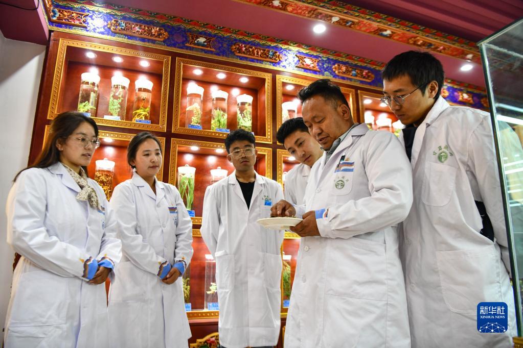 在藏藥材標本室,普窮次仁為學(xué)生講解藏藥材知識(4月20日攝)。