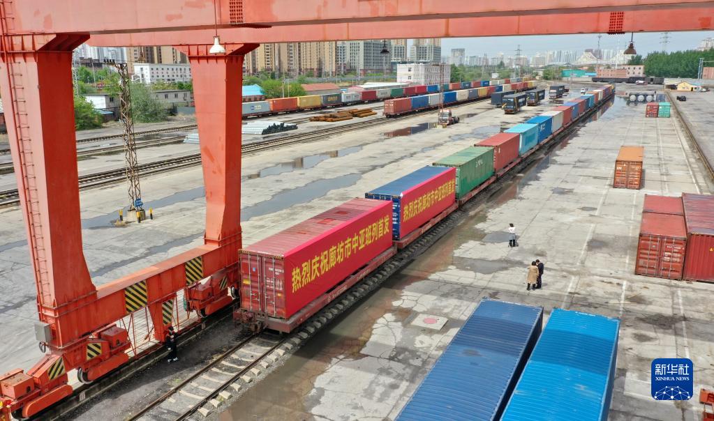 4月28日,首列中歐(中亞)班列(廊坊——塔什干)??吭诶确槐辫F路貨場(chǎng),準備發(fā)車(chē)(無(wú)人機照片)。