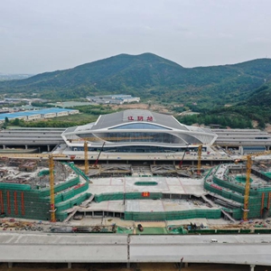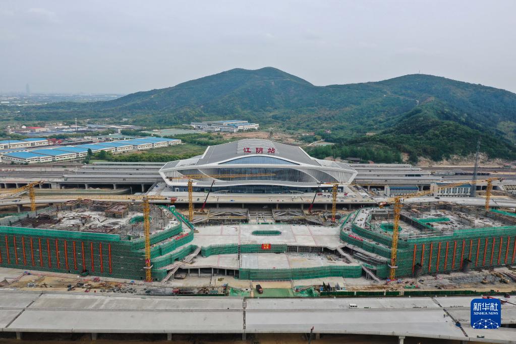 這是滬寧沿江高速鐵路江陰站站房(4月28日攝,無(wú)人機照片)。