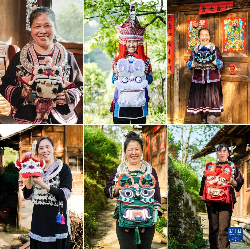 4月26日,少數民族繡娘在廣西桂林市龍勝各族自治縣與自己縫制的產(chǎn)品合影。