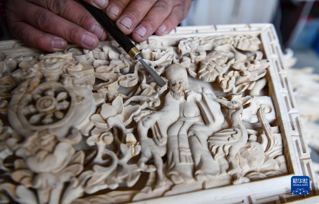 拉巴次仁在制作木雕(4月25日攝)。