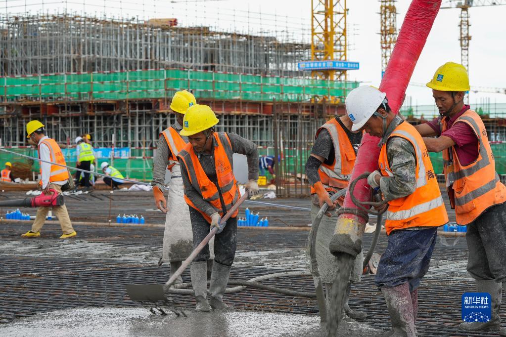 4月29日,中建三局參建人員在廣州白云國際機場(chǎng)三期擴建工程T3航站樓項目現場(chǎng)澆筑混凝土。