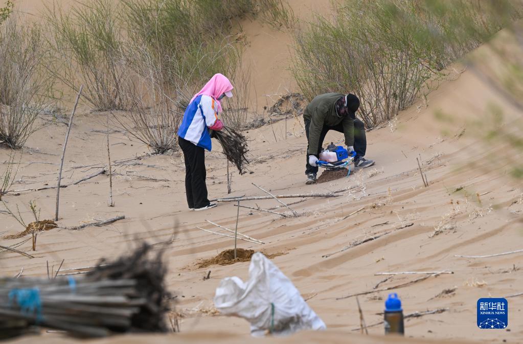治沙客周斌祿(右)和妻子在內蒙古庫布其沙漠億利生態(tài)治理區種植苗木(4月27日攝)。