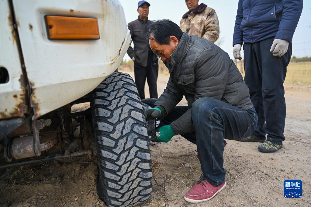 在內蒙古庫布其沙漠億利生態(tài)治理區,來(lái)自甘肅的朱虎明在修理汽車(chē)(4月26日攝)。今年,他帶著(zhù)20多名老鄉來(lái)到庫布其沙漠億利生態(tài)治理區治沙。