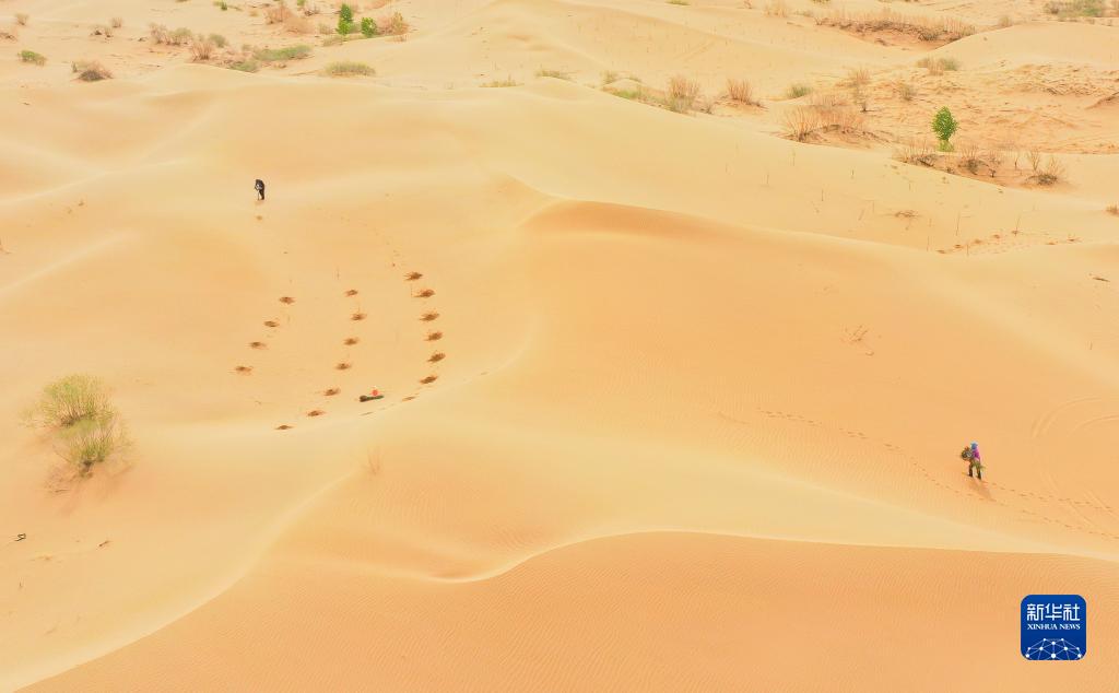 治沙客在內蒙古庫布其沙漠億利生態(tài)治理區種植苗木(4月27日攝,無(wú)人機照片)。