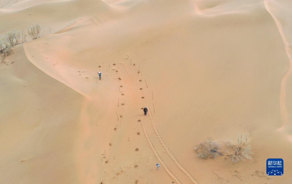 治沙客在內蒙古庫布其沙漠億利生態(tài)治理區種植苗木(4月27日攝,無(wú)人機照片)。