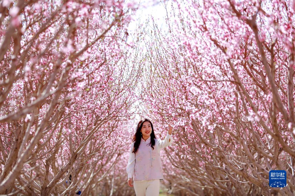 4月29日,游客在甘肅省酒泉市肅州區西洞鎮果園賞花游玩。