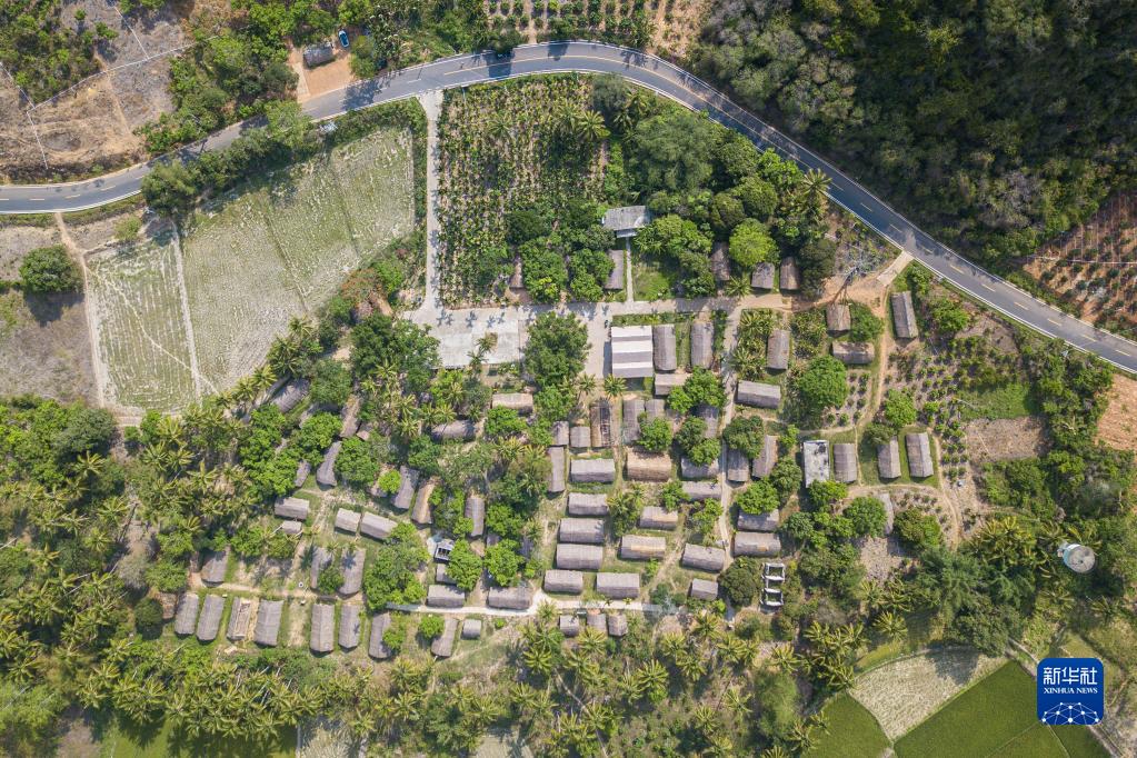 4月28日在海南省東方市白查村拍攝的黎族船型屋及近年修建的道路(無(wú)人機照片)。