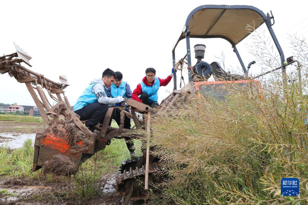 4月29日,在衡陽(yáng)縣西渡鎮新橋村,南華大學(xué)的大學(xué)生志愿者在檢修農機。