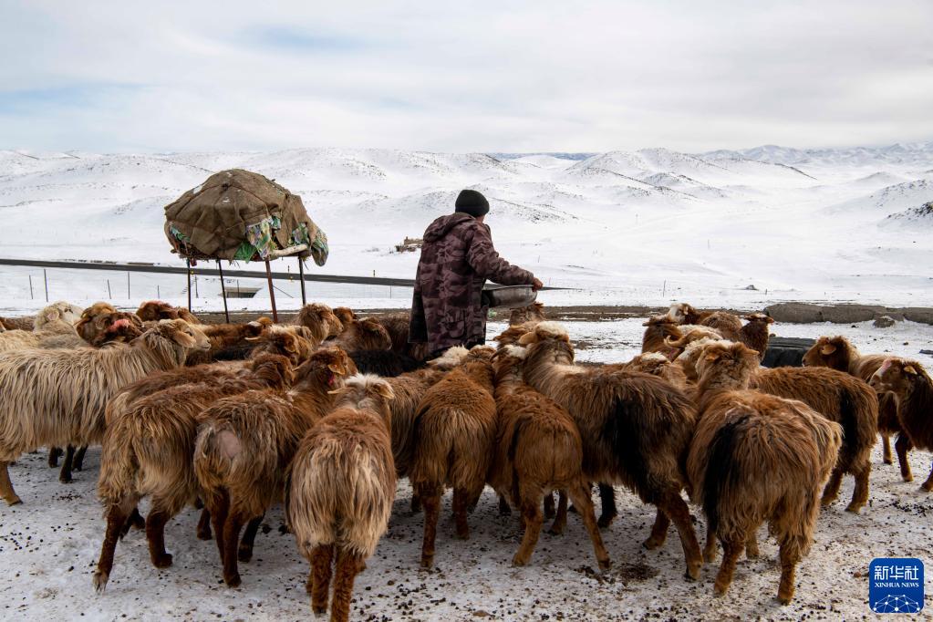 在新疆裕民縣巴爾魯克山南坡牧場(chǎng),年輕牧民賽孜木·哈布得拉什么給羊群喂飼料(2023年2月14日攝)。