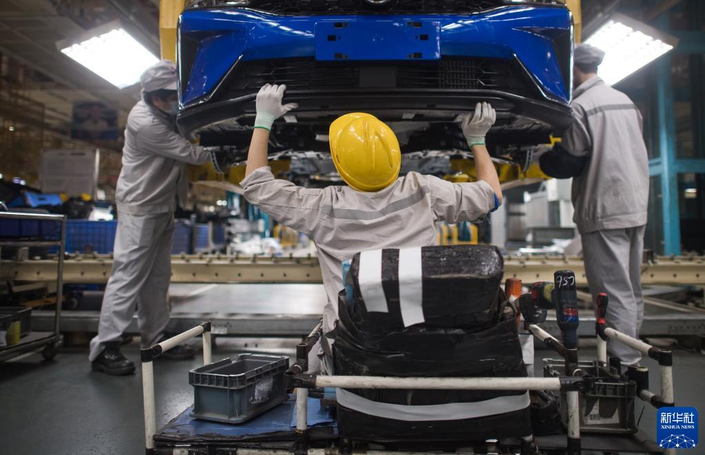 在位于湖北省武漢市的東風(fēng)乘用車(chē)公司工廠(chǎng)總裝車(chē)間,工人在流水線(xiàn)上生產(chǎn)作業(yè)(2020年3月24日攝)。