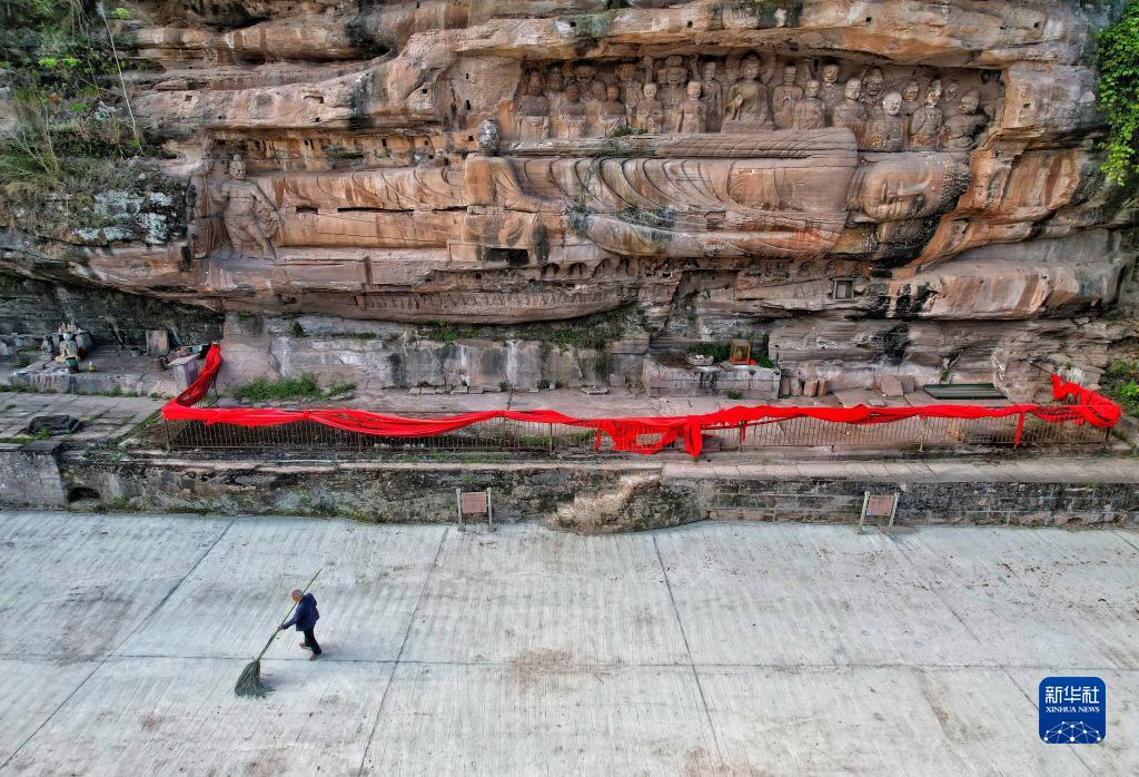 4月3日,吳忠富在臥佛院內打掃衛生(無(wú)人機照片)。