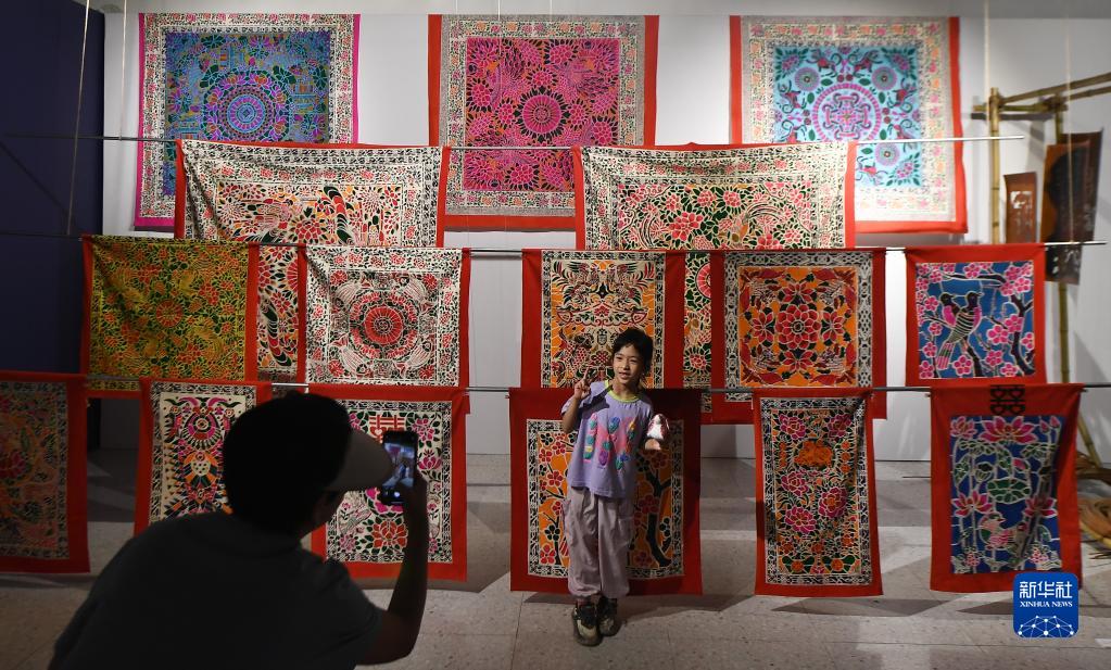 4月30日,觀(guān)眾在2023海南錦繡世界文化周非物質(zhì)文化遺產(chǎn)傳統織繡印染技藝項目精品展上拍照留念。