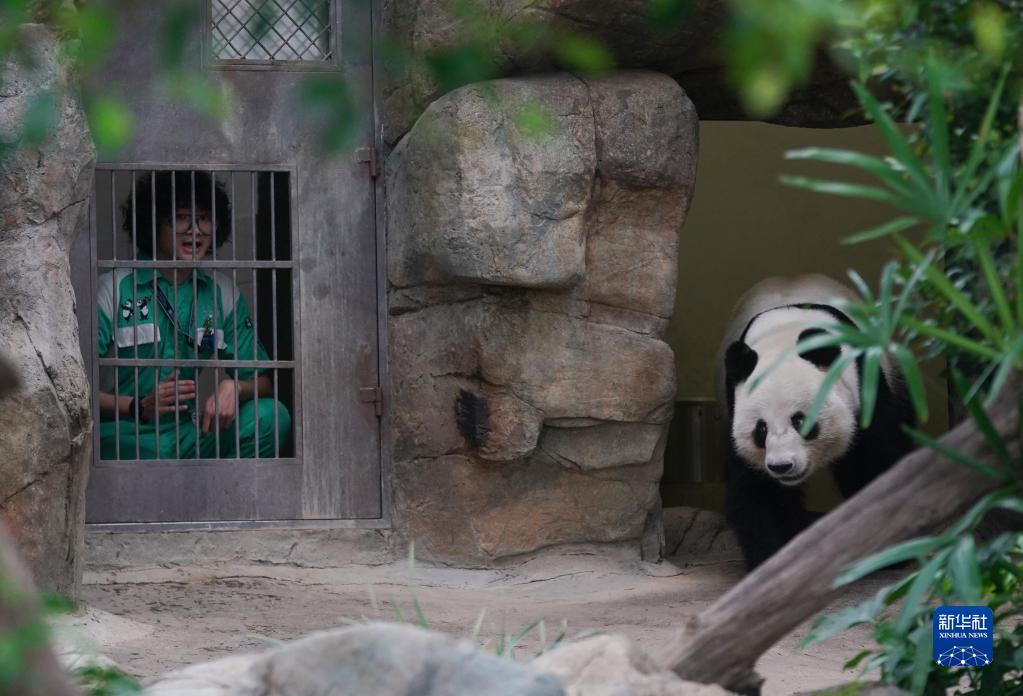 在香港海洋公園,大熊貓“奶爸”梁家綸在呼喚大熊貓“樂(lè )樂(lè )”(4月19日攝)。