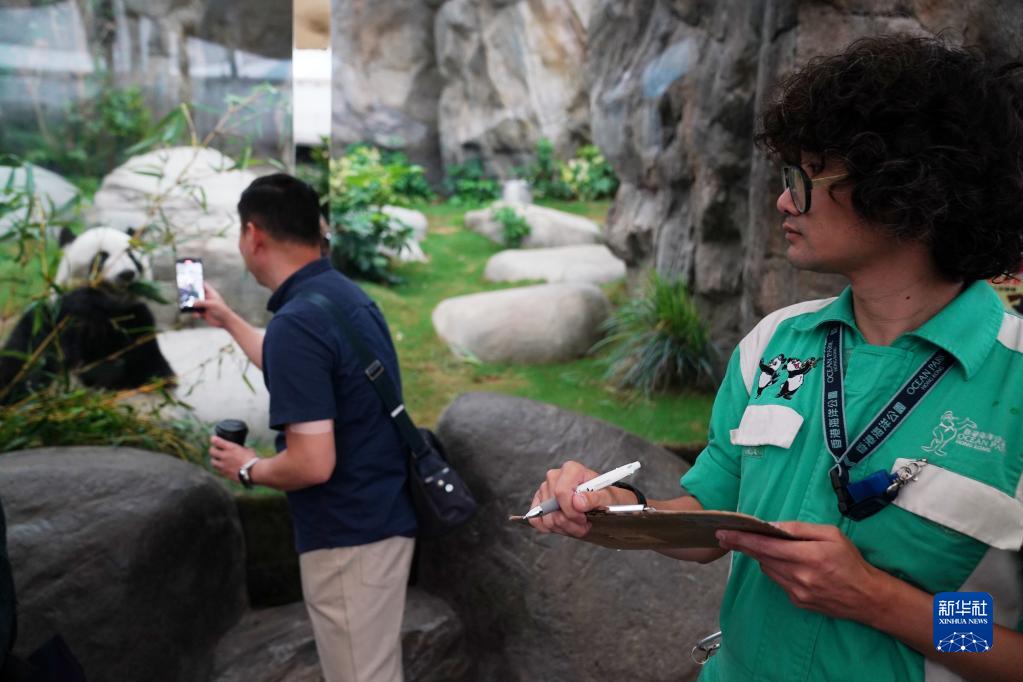 在香港海洋公園,大熊貓“奶爸”梁家綸(右)觀(guān)察大熊貓“盈盈”的狀態(tài)(4月19日攝)。