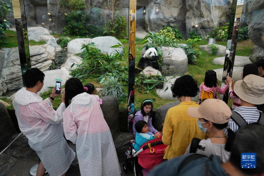 在香港海洋公園,游客用手機拍攝大熊貓“盈盈”(4月19日攝)。