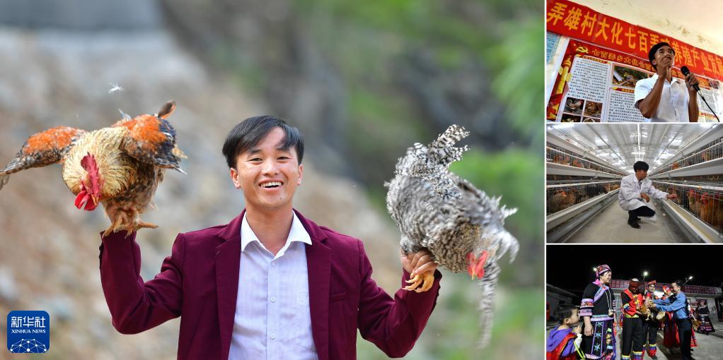 拼版照片:左圖為在廣西大化瑤族自治縣七百弄鄉弄雄村,藍志平展示七百弄雞(2019年11月10日攝);右上圖為在弄雄村七百弄雞養殖產(chǎn)業(yè)發(fā)展動(dòng)員會(huì )上,藍志平動(dòng)員群眾發(fā)展土雞養殖(2016年8月17日攝);右中圖為在弄雄村七百弄雞養殖場(chǎng),藍志平在查看種雞的生長(cháng)情況(2019年11月10日攝);右下圖為在大化瑤族自治縣大化鎮仁良村,藍志平(右)捐贈七百弄雞(2023年4月15日攝)。