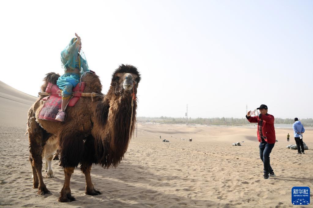 曹文華(右)為騎駱駝的游客拍照留念(4月24日攝)。