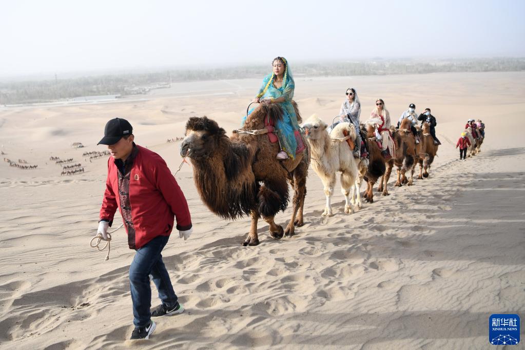 曹文華和他的駝隊載著(zhù)游客行走在鳴沙山月牙泉景區的駝道上(4月24日攝)。