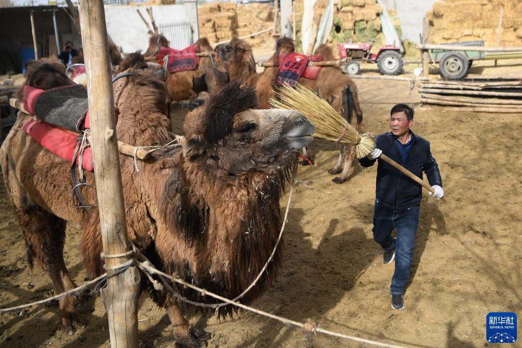 曹文華在駝圈里打掃衛生,為駱駝“上班”做準備(4月24日攝)。