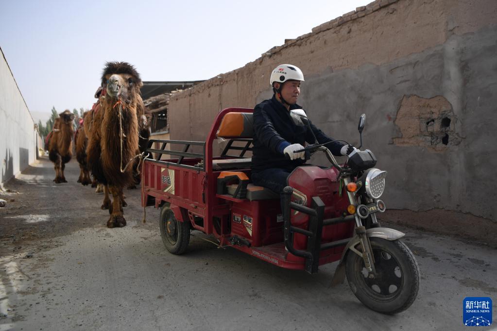 曹文華騎著(zhù)三輪車(chē)牽駱駝前往鳴沙山月牙泉景區(4月24日攝)。