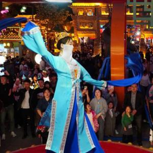 4月30日晚,游客在東平縣的大宋不夜城觀(guān)看表演。