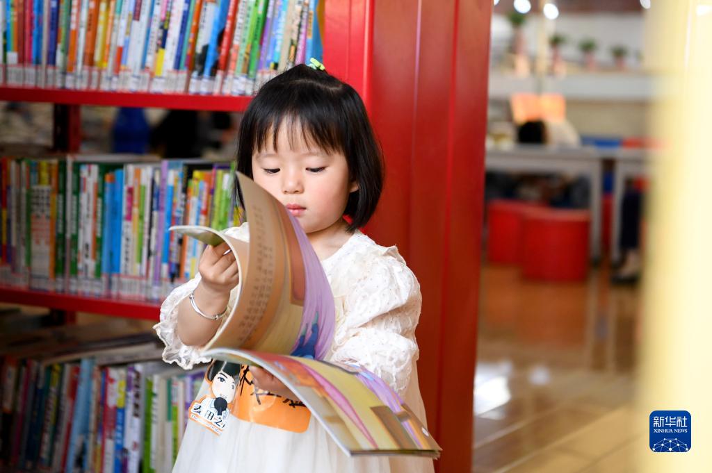 5月1日,小朋友在河南省平頂山市郟縣圖書(shū)館翻閱書(shū)籍。