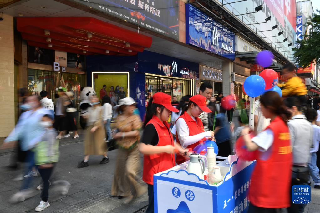 5月1日,志愿者在湖南省長(cháng)沙市天心區一處商圈做志愿服務(wù)。