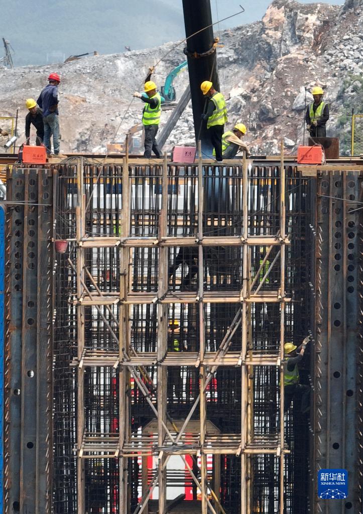 5月1日,在位于廣西柳州市柳江區穿山鎮的柳梧鐵路施工現場(chǎng),建設者在項目工地上忙碌(無(wú)人機照片)。