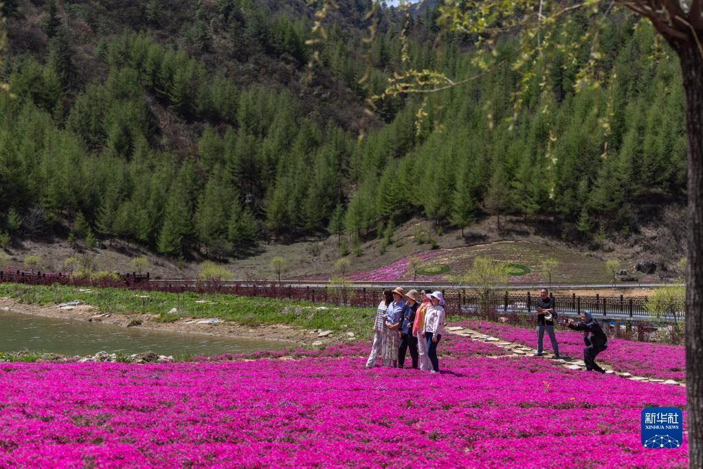 5月1日,在紅池壩國家森林公園,游客在花海中打卡拍照。