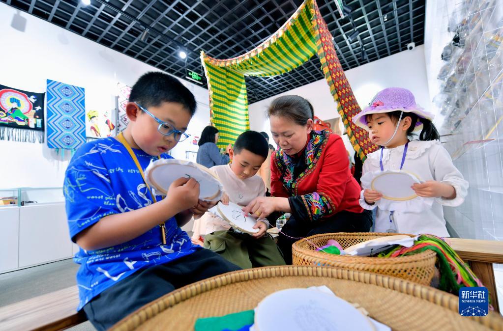 4月30日,小朋友在湖北省宣恩縣興隆老街學(xué)習土家刺繡。