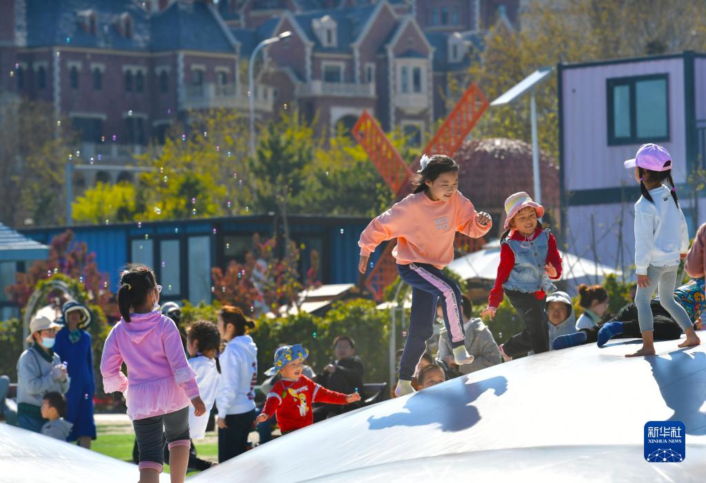4月30日,在遼寧省大連市塔河灣歡樂(lè )海岸,小朋友在游玩。