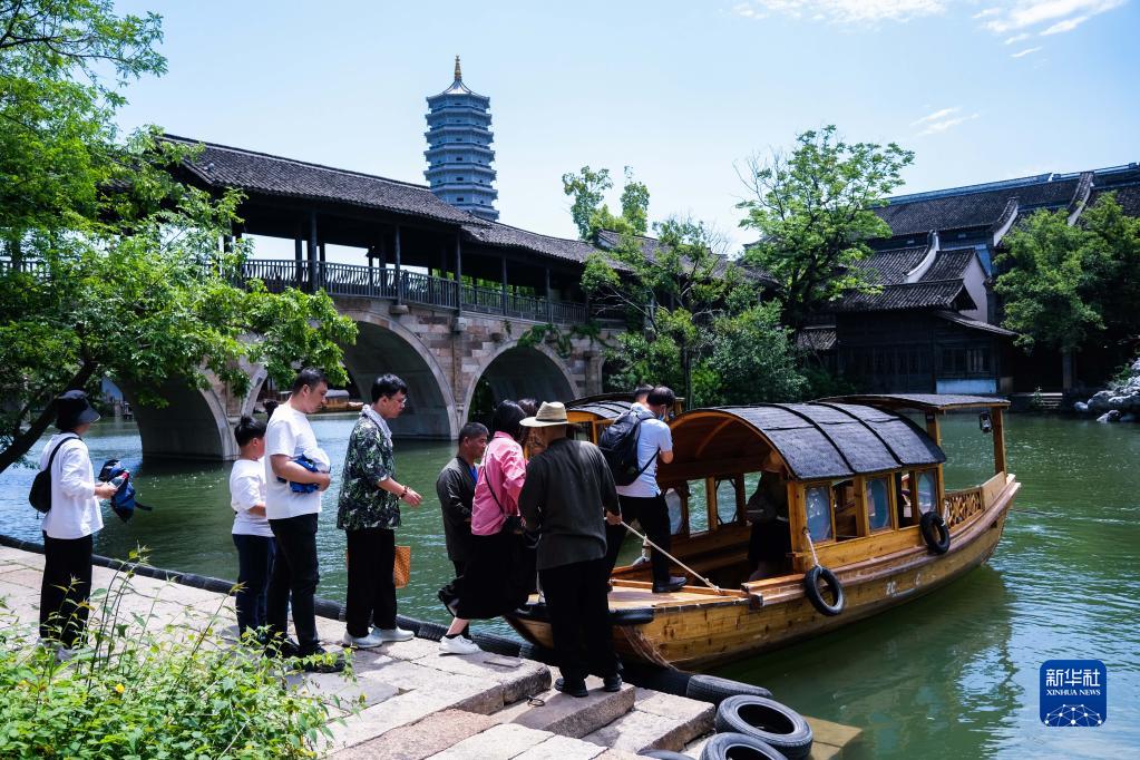 5月2日,游客在濮院時(shí)尚古鎮內準備乘船游覽。