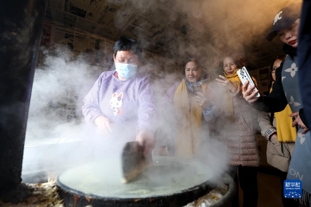 游客在錦江木屋村參觀(guān)煎餅制作過(guò)程(2023年4月6日攝)。