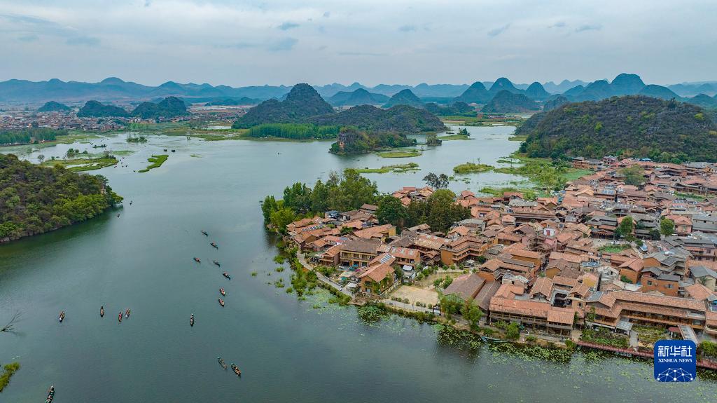 5月2日,游客乘船在云南省丘北縣普者黑濕地公園游覽(無(wú)人機照片)。