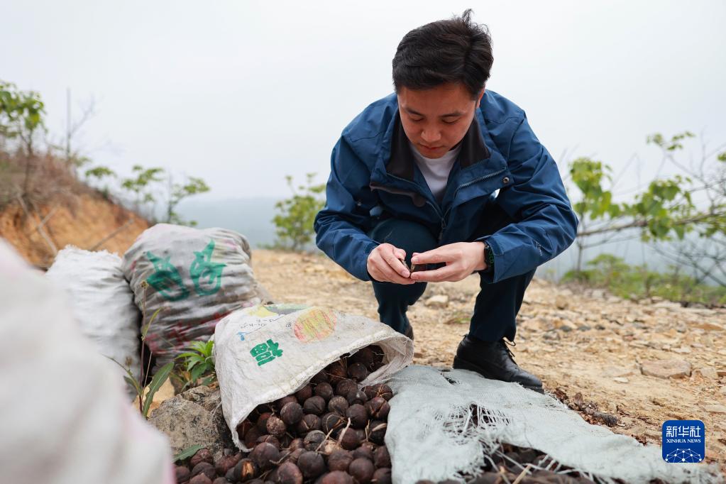 楊安仁檢查收獲的油桐果實(shí)(4月17日攝)。