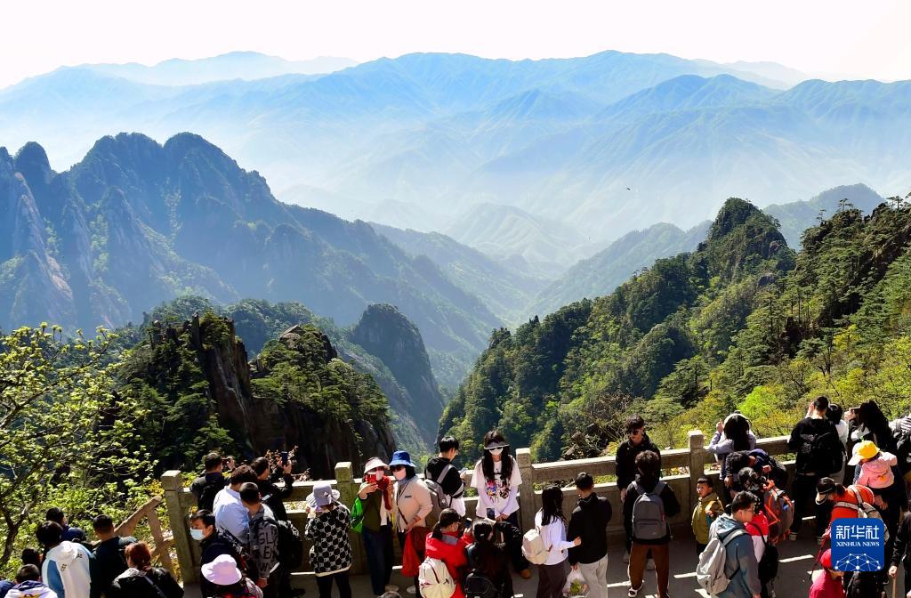 2023年4月30日,游客在黃山白鵝嶺賞景拍照。