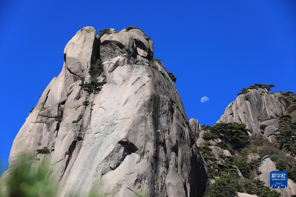 2022年10月16日拍攝的黃山怪石和上空的月亮。