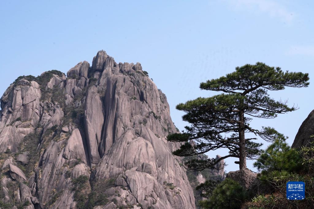 2023年4月10日拍攝的黃山最高峰蓮花峰和黃山松。
